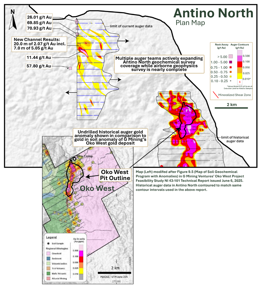 Note: Map shows the extent of historical and current auger sampling campaigns, channel sampling results, rock sample assays, and the scale of the largest auger anomaly compared with the gold-in-soil anomaly at G Mining’s Oko West deposit (inset). Note map scale and auger contour levels are the same for both maps.