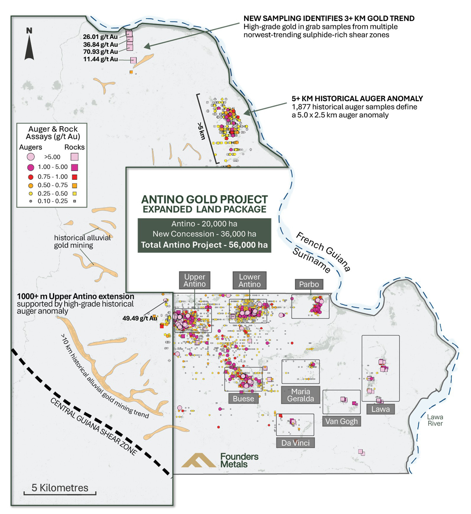 Colin Padget, President & CEO, commented “Acquiring this ground is transformational for Founders. We've nearly tripled our land position to 56,000 hectares and gained control of a district-scale opportunity in one of the world's most underexplored gold belts. What excites me most is the quality of targets we've just added. We have immediate opportunities to extend Upper Antino's high-grade gold mineralization along a 1,000-metre strike extension supported by historical auger data. In the northern part of the new area, there's a multi-kilometre network of high-grade shears plus a separate auger anomaly—larger than Upper Antino—that has never seen a drill hole. This acquisition gives us both near-term catalysts and long-term district potential as a premiere explorer in Suriname and the Guiana Shield.”