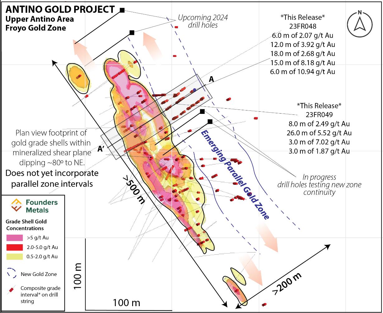 Colin Padget, Founders' CEO, commented, "We continue to define and expand the impressive gold mineralization at Froyo, and these two holes are further evidence of a much broader gold system than previously recognized by earlier explorers on the property. We are adding ounces with every drill hole and as we continue drilling at Froyo, our focus is expansion and efficient resource definition work. We are also set to begin drill testing some new Upper Antino targets as part of our larger 2024 exploration plans."