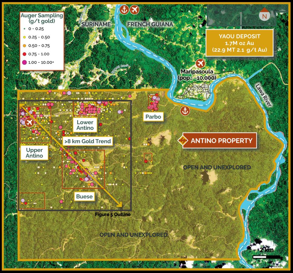 Map of the Antino Gold Project concession area showing gold concentrations from historical auger sampling. Most of the property remains unexplored.