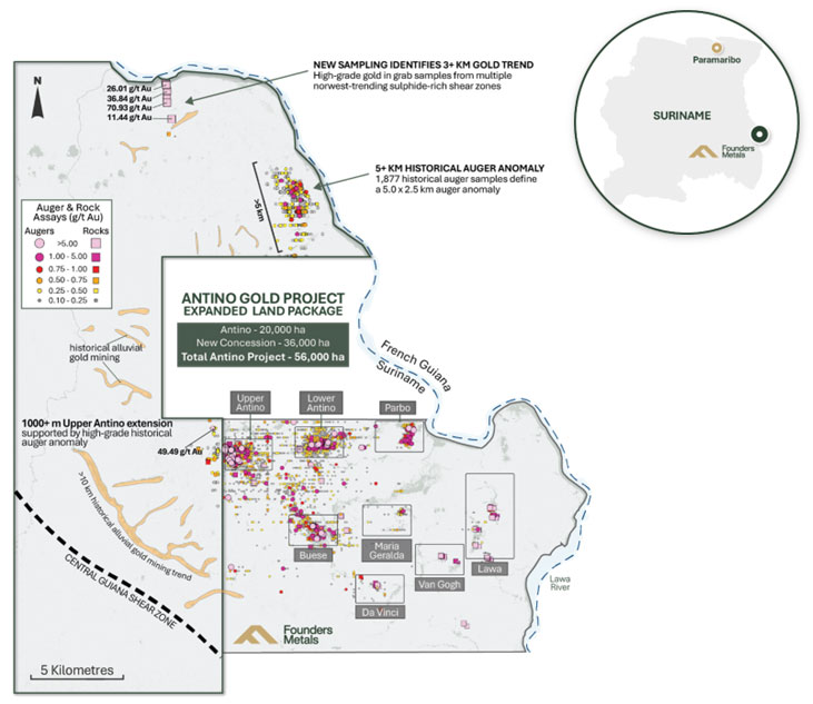 Founders Metals is a Canadian-based exploration company focused on advancing the Antino Gold Project located in Suriname, South America, in the heart of the Guiana Shield. Antino is 56,000 hectares and has produced over 500,000 ounces of gold from historical surface and alluvial mining to date1. The Company is systematically advancing one of Suriname's most promising gold exploration and development opportunities with drill-confirmed, district-scale potential. Founders is committed to responsible exploration, community engagement, and delivering long-term value to shareholders through technical excellence and strategic growth in the Guiana Shield.