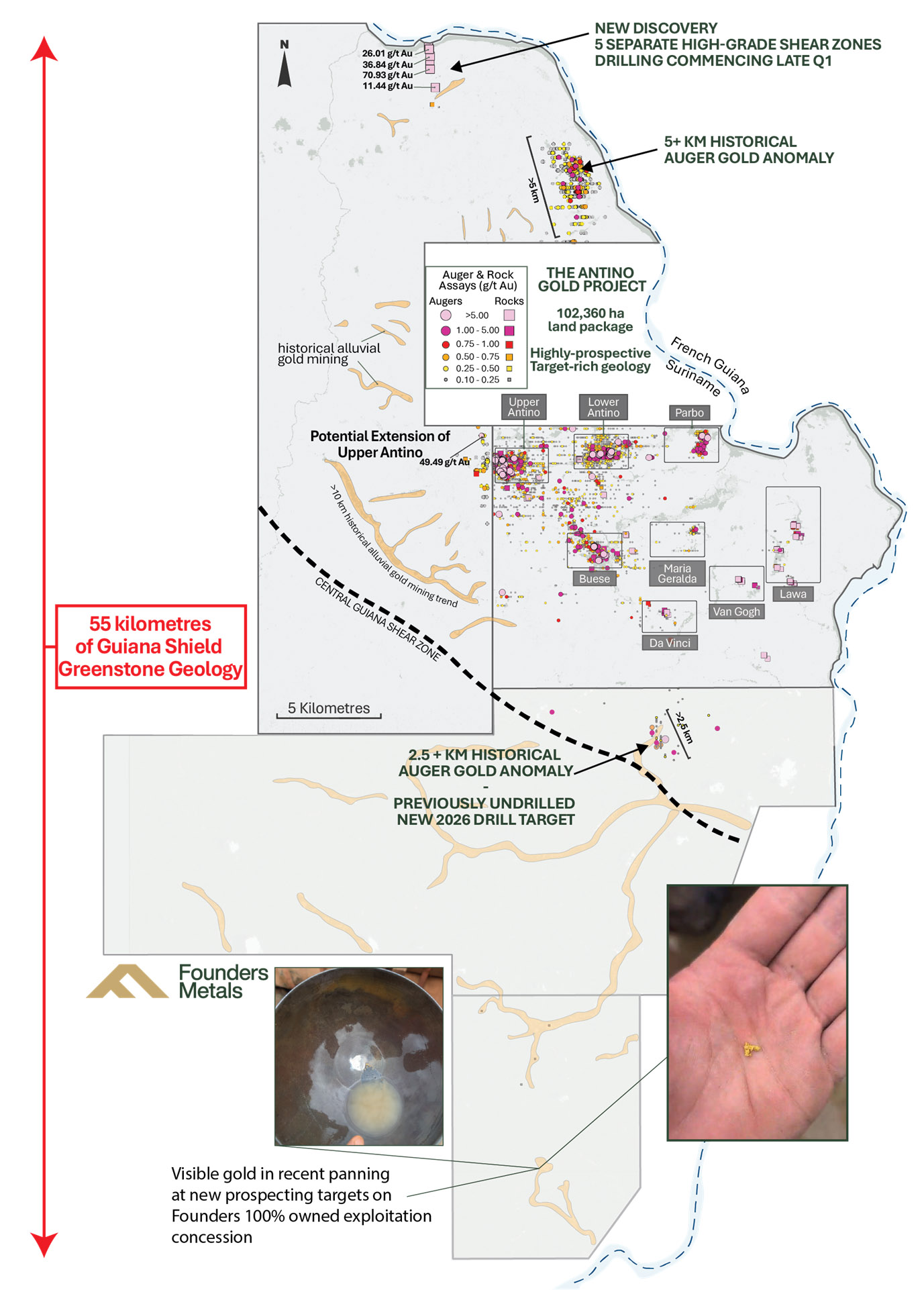 Colin Padget, President & CEO, commented: "These acquisitions mark a major milestone for Founders. We have effectively consolidated an entire gold district covering over 100,000 hectares of Guiana Shield greenstone geology proven to host multi-million-ounce gold deposits. From historical exploration, artisanal mining activity, and our own drilling, it is clear the area is underlain by a world-class gold system. Founders is now uniquely positioned to systematically explore this entire land package while advancing our most promising targets toward resource definition."