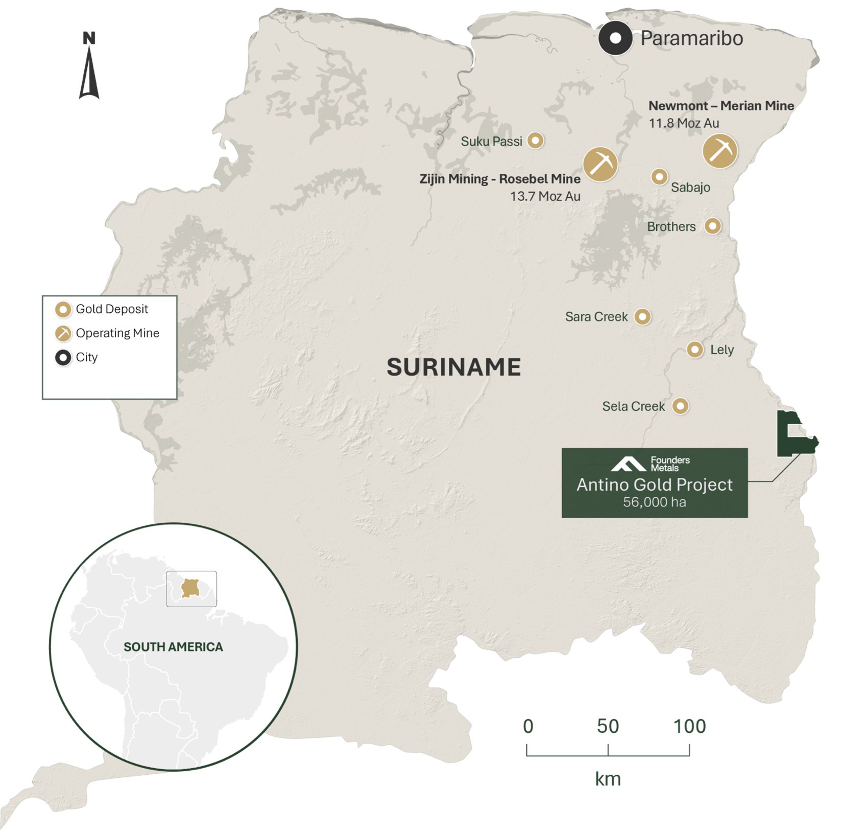 Founders Metals is a Canadian-based exploration company focused on advancing the Antino Gold Project located in Suriname, South America, in the heart of the Guiana Shield. Antino is 56,000 ha and has produced over 500,000 ounces of gold from historical surface and alluvial mining to date2. The Company is systematically advancing one of Suriname's most promising gold exploration and development opportunities with drill-confirmed, district-scale potential. Founders is committed to responsible exploration, community engagement, and delivering long-term value to shareholders through technical excellence and strategic growth in the Guiana Shield.