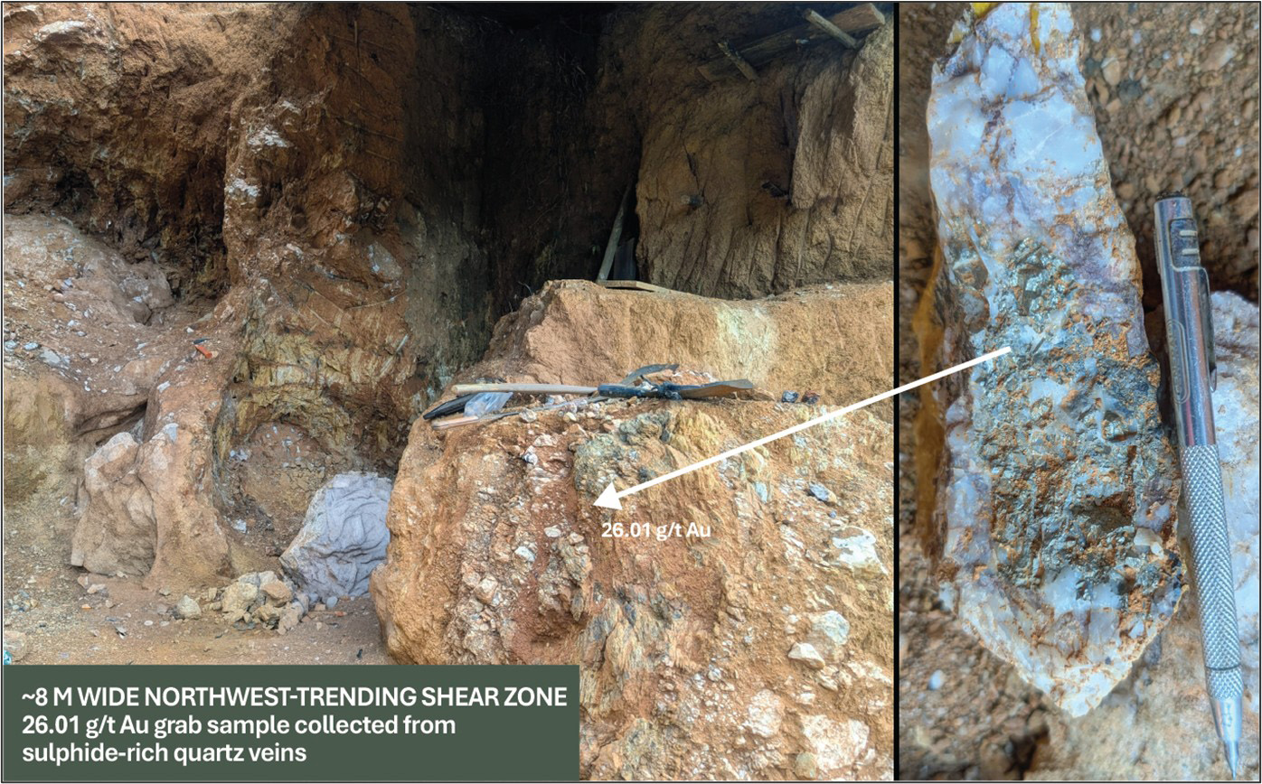 - Multiple High-Grade Shear Zones Identified: Recent grab sample1 results from separate shear zones (Figure 3) along a 3+ km trend include, 26.01 grams/tonne (g/t) gold (Au), 36.84 g/t Au, 11.44 g/t Au, and 70.93 g/t Au