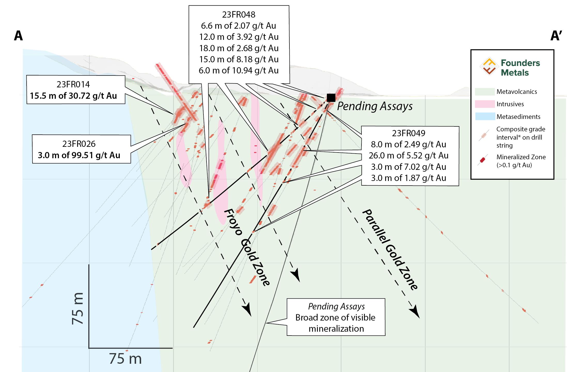 Colin Padget, Founders' CEO, commented, "We continue to define and expand the impressive gold mineralization at Froyo, and these two holes are further evidence of a much broader gold system than previously recognized by earlier explorers on the property. We are adding ounces with every drill hole and as we continue drilling at Froyo, our focus is expansion and efficient resource definition work. We are also set to begin drill testing some new Upper Antino targets as part of our larger 2024 exploration plans."