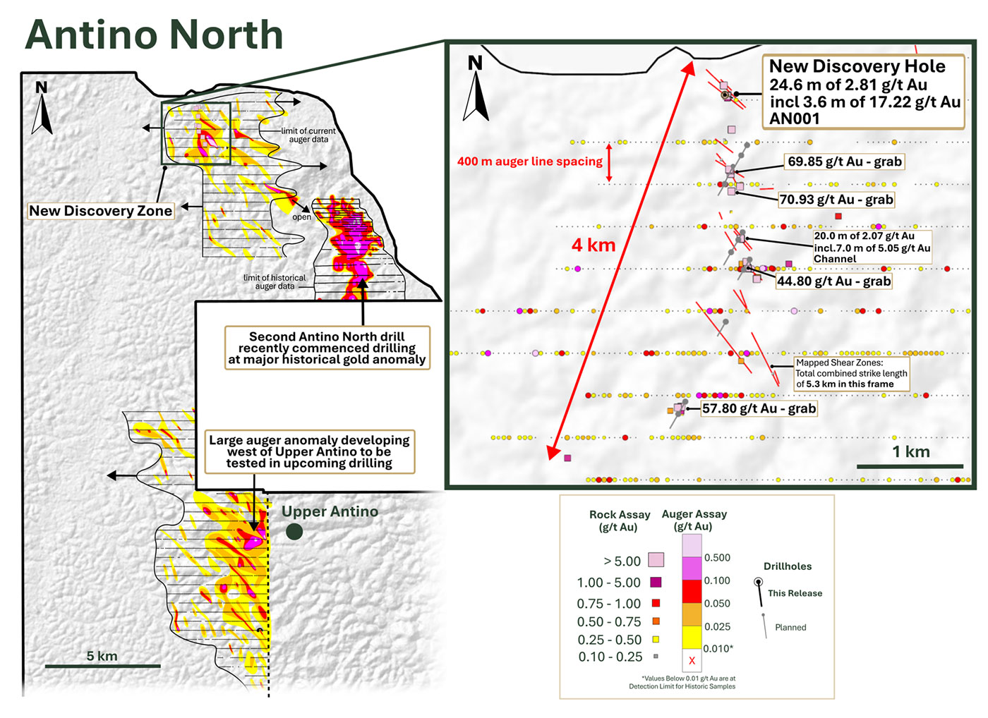 Colin Padget, President & CEO, commented, “The Antino North area covers nearly 10,000 hectares of highly prospective geology that has never seen a drillhole — so we are thrilled to see such high-grade results from our first diamond hole into the area. Our team on the ground has so far mapped twelve parallel shear zones across and along strike of the intercepted structure, and we plan to test many of them over the current ~3,500 metre phase-one drill program. This Antino North discovery reinforces our belief that the larger Antino Project is host to a major district-scale gold system, and there remains significant exploration upside and opportunity for further discoveries with this year’s exploration program.”