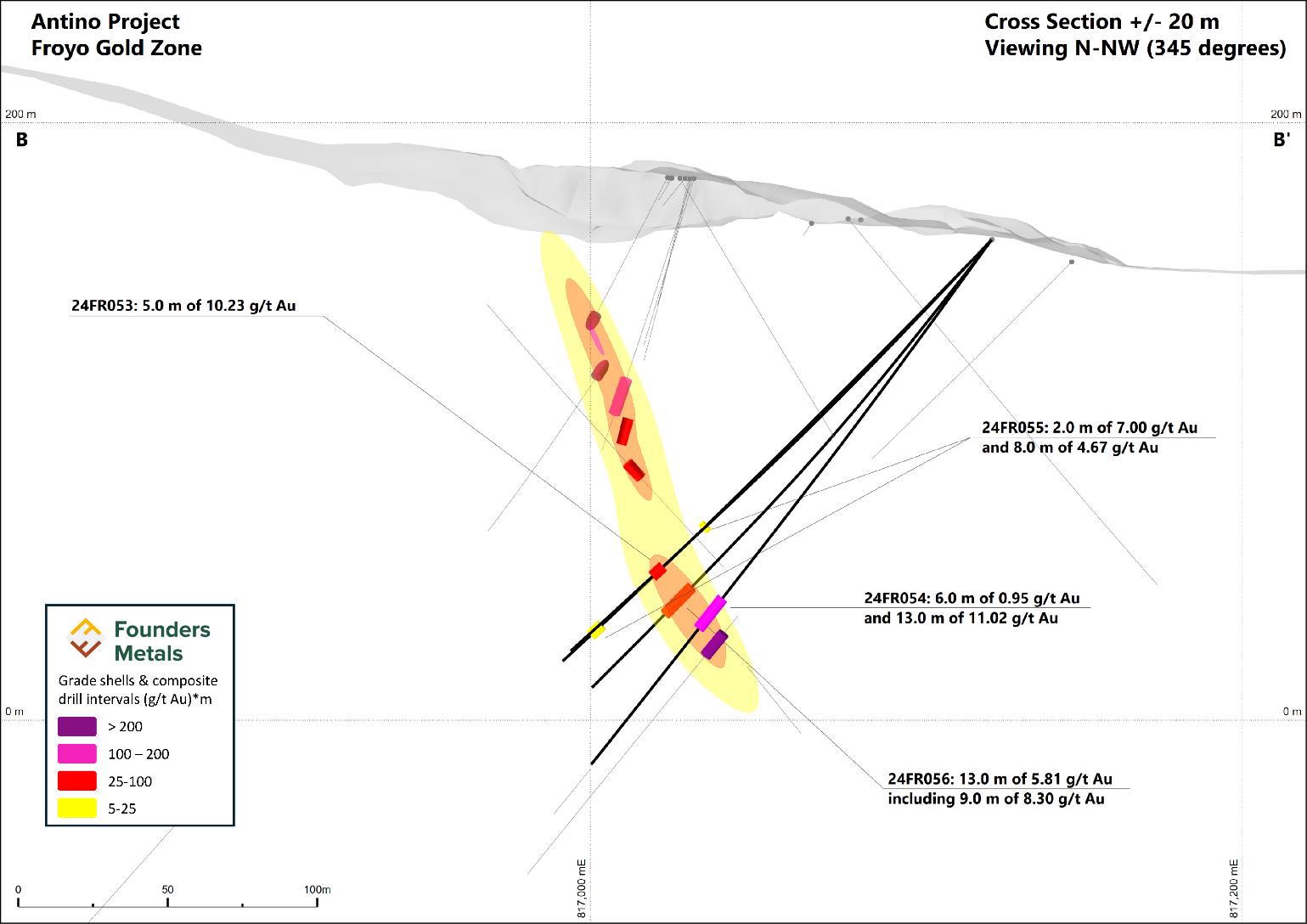 Colin Padget, Founders CEO commented, "These infill results from Upper Antino's Froyo Gold Zone provide a clear indication of the continuity and strength of gold grades within the main Froyo shear, particularly as we drill to greater depths within the system. We have also completed several expansion drill holes along strike to the northwest and to the south at Froyo and we're eager to receive those results. Additionally, starting this week, we are adding oriented core to all of our drilling to further improve our understanding of the gold system and the structural controls on gold mineralization."
